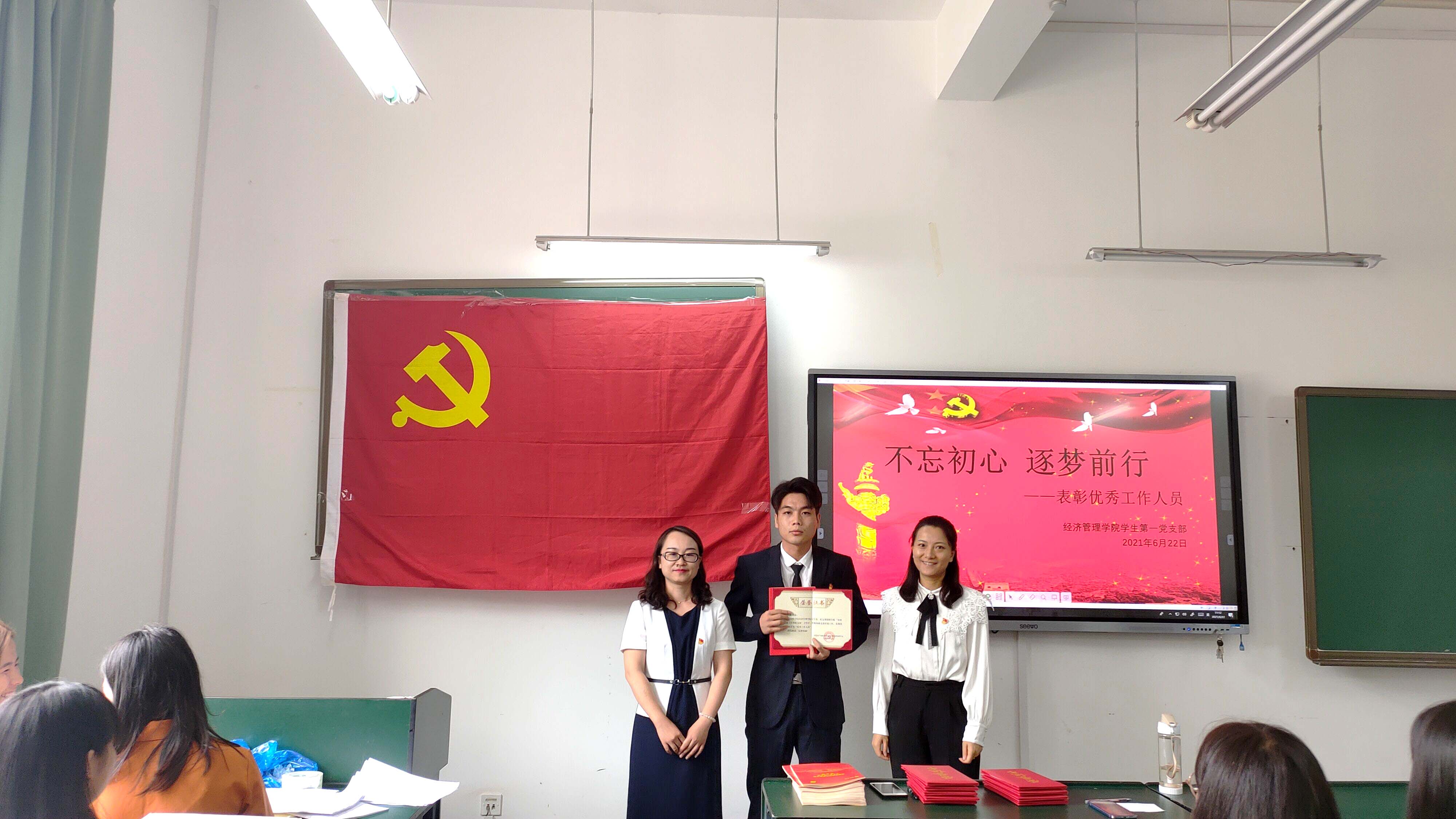 为进一步激励支部工作者创先争优,推进党建工作创新,使党支部和全体党员充分发挥战斗堡垒作用和先锋模范作用,2021年6月22日下午金年会官方网站入口员工第一党支部组织党员和积极分子一起在博雅楼1121开展“不忘初心、逐梦前行”主题党日活动,表彰在创建全国样板支部过程中作出突出贡献的党员同志。