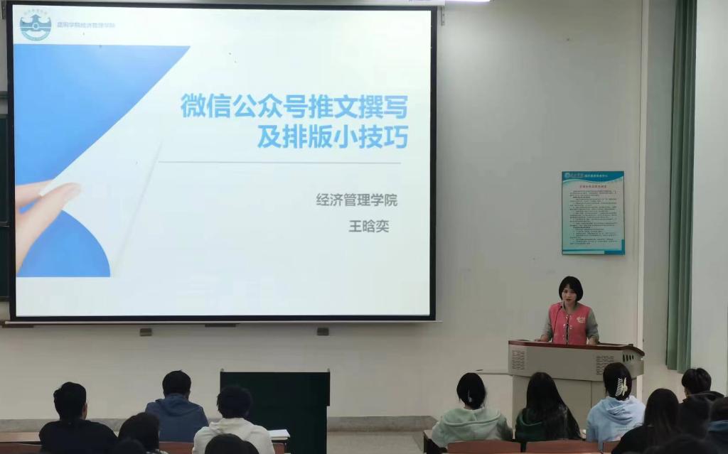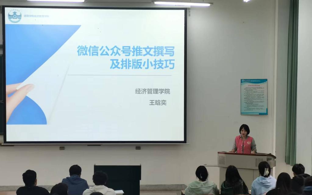 培训会上,樊传章老师从新闻稿的标题、正文、字数、配图等角度讲解了新闻稿的写作技巧和注意事项,尤其从新闻稿的实效性、政治性、内容审核把关的要点等方面进行了举例说明。团委负责人王晗奕老师通过文案撰写、排版技巧、拍照技巧三个方面,对公众号推文进行了深入的讲解,同时提出了写作时的注意事项,对同学们提升新闻稿和推文撰写水平、提高个人审美素养均有很大的帮助。