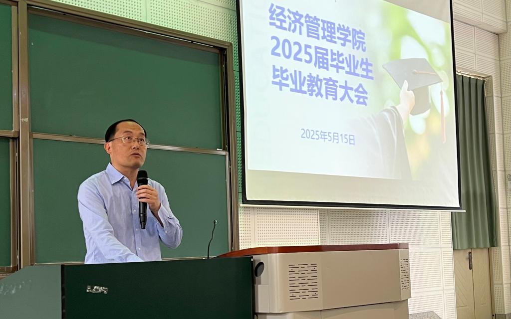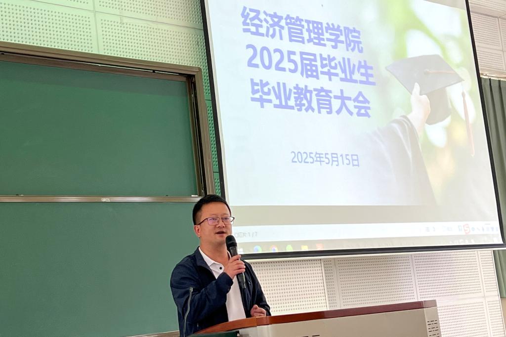 大会伊始,经理张必清教授以“从温室幼苗到扎根大地”为主题发表致辞。他回顾2025届毕业生四年的成长历程,称赞他们从青涩学子蜕变为兼具专业素养与实践能力的“经管人”,勉励学子们“社会如移栽大田的红薯苗,须经历风雨方能茁壮。未来无论是踏入职场、军营,还是走向国际舞台,望你们始终以创新破局、以责任立身、以视野致远。”张经理还特别强调“三重修炼”的重要性:面对全球经济变革与科技浪潮,毕业生需以创新思维破解行业困局,以商业向善守护管理本质,以全球视野讲好中国故事。他引用张载名言“为天地立心、为生民立命”,呼吁学子肩负使命担当,在时代浪潮中实现个人与社会的共赢。