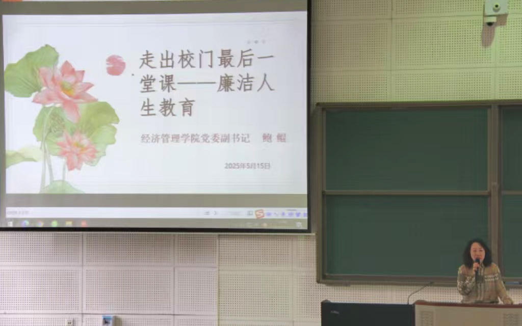 党委副书记鲍鲲为毕业生带来“走出校门最后一堂课——廉洁人生教育”。她指出,“廉洁自律是职场与人生的基石”,并叮嘱学子在未来的岗位上恪守底线、正直做人,将清廉品格融入职业生涯。“社会复杂,但应对之道可简化为‘有所不为,才能有所为’。”鲍老师嘱咐各位毕业生走上就业岗位一定要遵纪守法,她的谆谆教导引发全场共鸣。