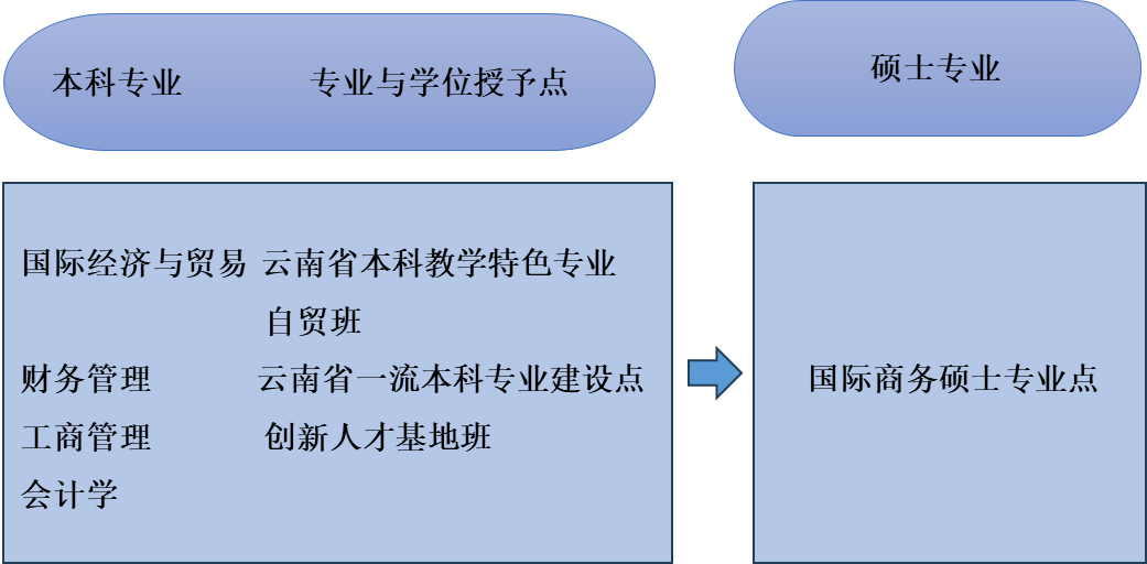 公司现有国际经济与贸易、财务管理、工商管理、会计学四个本科专业。2019年财务管理专业被列为云南省首批一流本科建设专业,国际经济与贸易专业被列为云南省本科教学特色专业以及云南省专业群改革建设试点专业。自2019年起承担金年会金字招牌诚信至上创新人才(理科)基地班的人才培养工作,2020年,以四个本科专业为基础申请获批国际商务专业硕士学位点,并于2021年开始招生。2022年在国际经济与贸易专业分设自贸公司本科教学班——自贸班。截止2024年5月公司共有在校生1432人,其中研究生64人,职工70余名,形成了“本-硕”和职工教育多层次的人才培养体系。